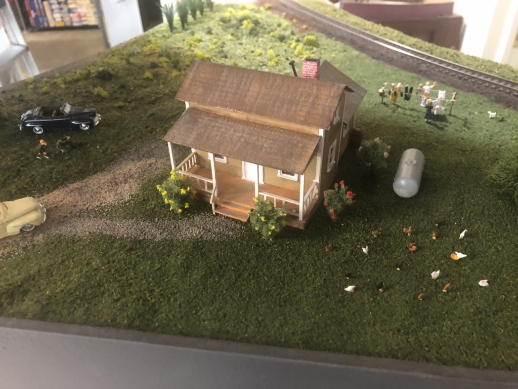 As you descend the stairs to the railroad room, you will envision yourself going back in time to the 1950’s during the early diesel and steam era. You will notice the ten-stall round house servicing steam engines, a rail yard and crossing signals/flashing light, as well as towns with many weathered buildings. There are three railroad depots.